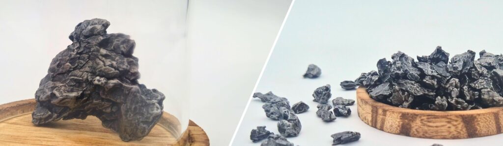 Visualmente, los fragmentos en bruto tienen forma irregular. Su superficie oscura muestra unos huecos característicos llamados regmagliptos. Estas cavidades se forman cuando los fragmentos atraviesan la atmósfera. Así que cada pieza tiene un aspecto único, a veces perforado por agujeros naturales.